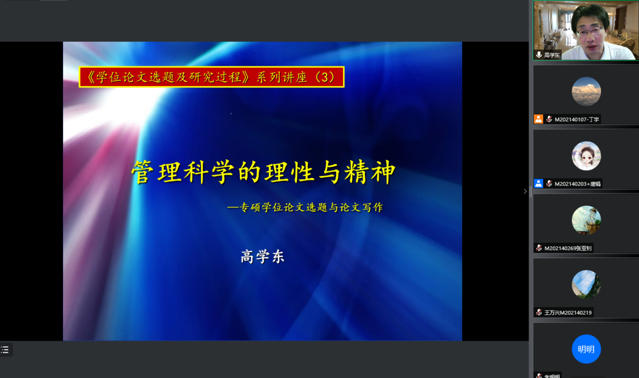 接下来,高学东教授基于管理科学的理性与精神出发,从管理科学的本源、管理科学的研究过程、科学精神及思维、研究角度等方向为同学们作了详细介绍。高教授列举出包括企业资源管理、信息化实施与案例实践等,基于这些丰富的管理科学案例资源,指出实际问题和关联对象的科学分析思路,寻找更多具有关联关系的对象群体,也就是找出科学本质。同时提到了对于复杂问题,可以在掌握信息的基础进行简化,但在客观事物简化的过程中,理性思维指导的定性和定量分析同等重要。也特别提到了科学精神就是克服一切传统偏见,用理论重塑人类的整个生活方式,包括我们在研究过程中需要的思维方式和做事方式。