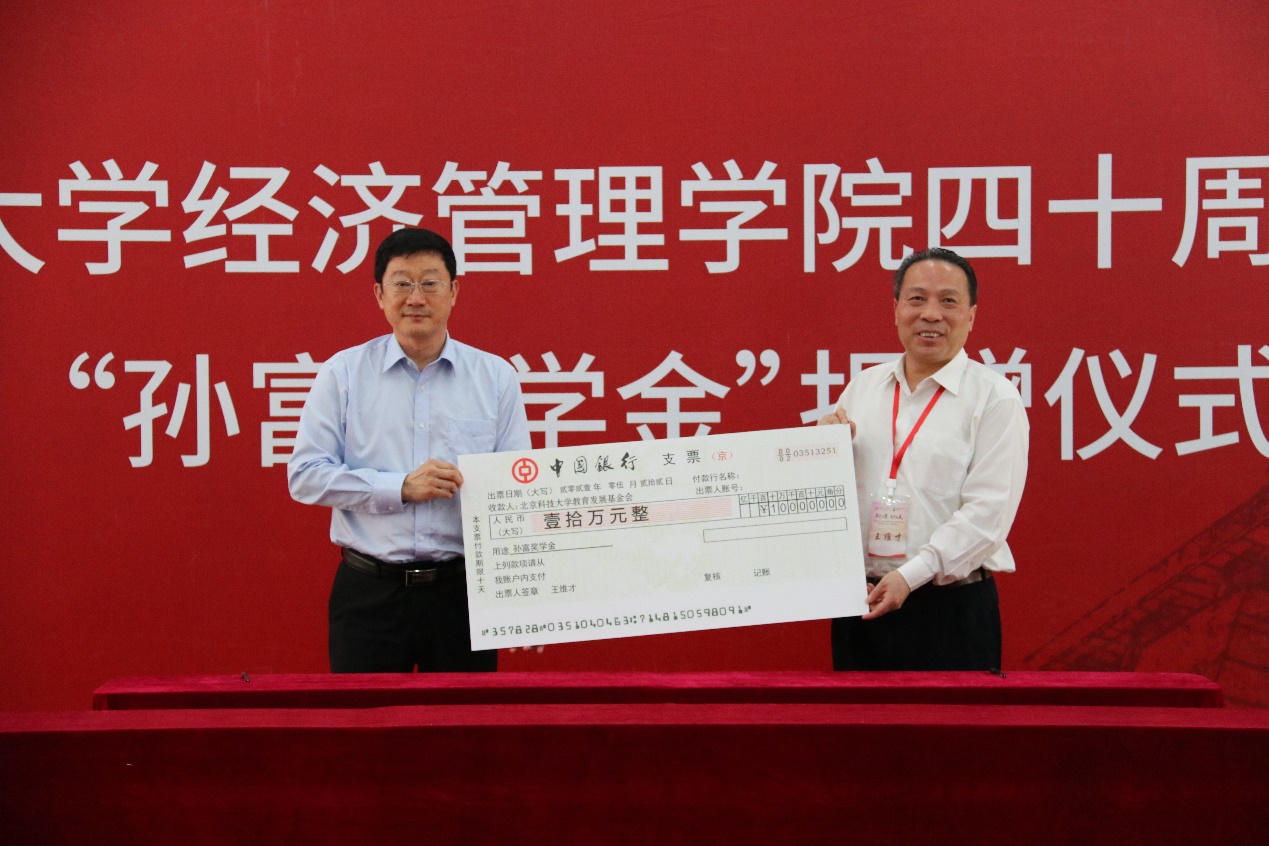5月22日上午10时,bwin必赢唯一官方网站“孙富奖学金”捐赠仪式在教职工活动中心会议室成功举办。孙富奖学金是为纪念学校原管理科学系首任系主任孙富教授,由其学生王任群先生于2001年发起成立的。校友代表北科大副校长、管研85级校友王维才,北科大教授、管研85级校友佘元冠(受宋关昶,工行甘肃省分行行长、管研85级校友委托),北京时代凌宇科技股份有限公司董事长兼总裁、管博03级校友黄孝斌,中民集团控股有限公司董事长、EMBA13级校友郭捷,中民集团控股有限公司总经理、EMBA13级校友吴俊波,中民集团控股有限公司运营总监、MBA17级校友曲楠,以及bwin必赢唯一官方网站副校长何民庆,校友会办公室、基金会办公室主任何进,bwin必赢唯一官方网站党委书记武森,校友会办公室、基金会办公室副主任杨志国,校友会办公室、基金会办公室综合科科长赵清,校友会办公室、基金会办公室李佳宁出席捐赠仪式。活动由武森主持。